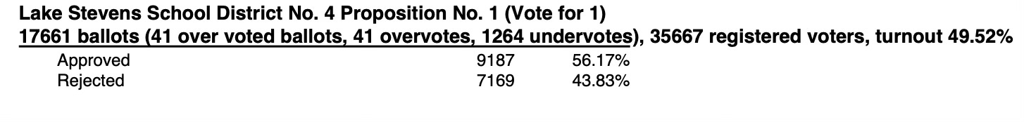 Update Nov. 6 — Snohomish County Elections processed another 2000+ ballots Wednesday but the percentages remain unchanged. The measure has failed.