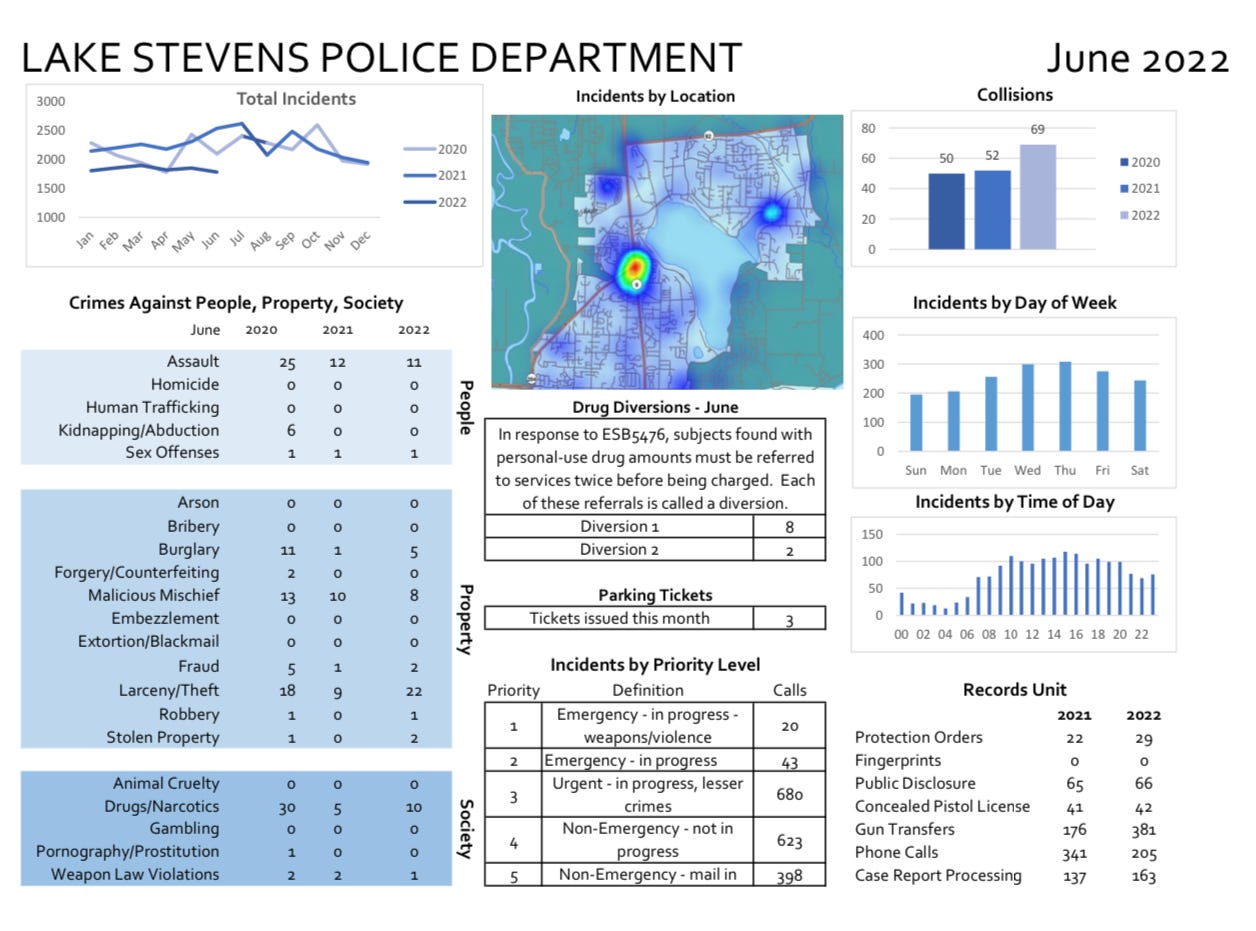 Serious crime is down in nearly every category year-over-year according to the Lake Stevens Police Department’s latest visualization.
