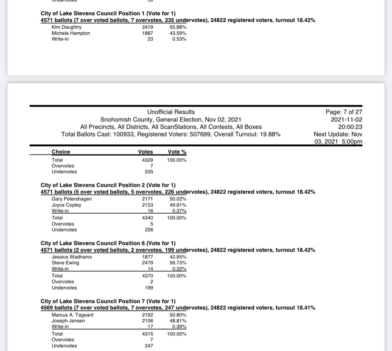 With 100% of on-hand ballots counted, it appears that Lake Stevens’ three incumbent City Councilmembers have retained their seats, while a fourth clings to an 18 vote lead.