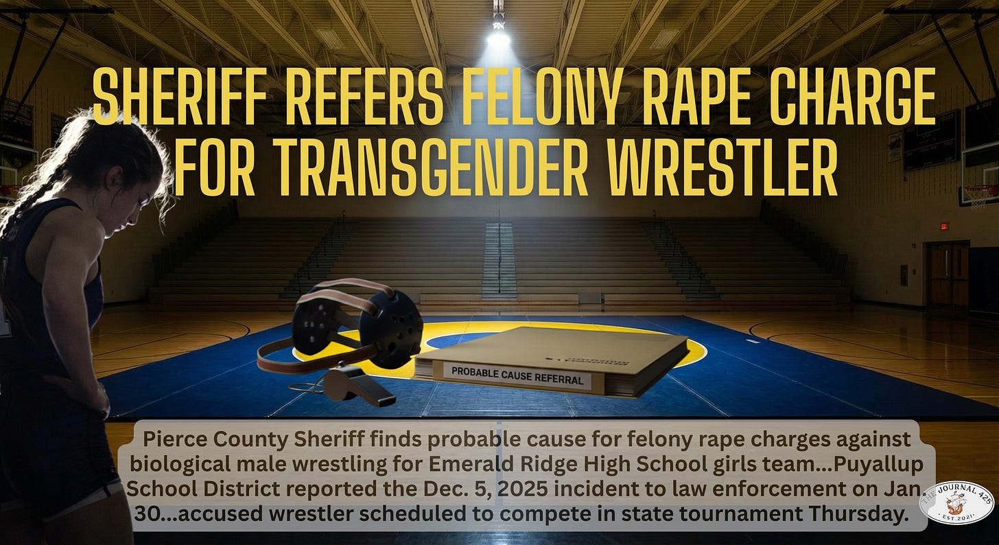 PIERCE COUNTY — A transgender (biological male) wrestler competing for the Emerald Ridge High School (ERHS) girls wrestling team is the subject of a felony rape charge referred to prosecutors by the Pierce County Sheriff’s Office last week, J425 can exclusively report.