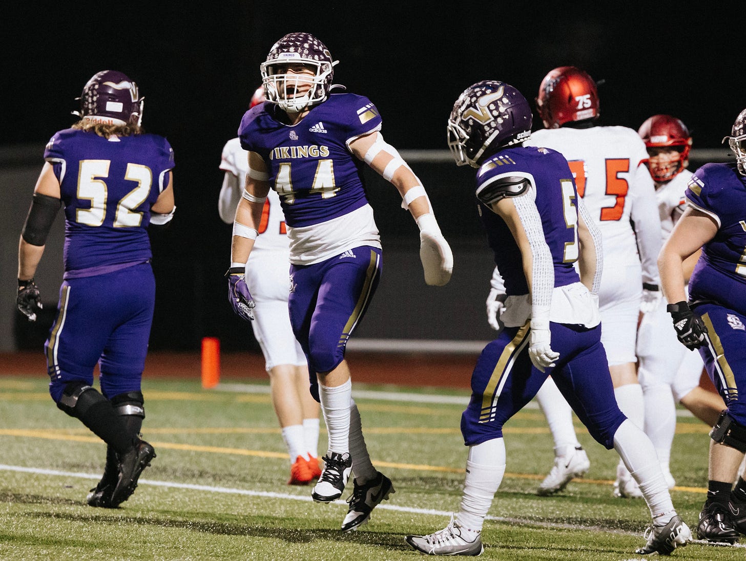 Viking defense took over from there, stuffing KC's running and passing efforts, beginning with Mason Turner's sack of quarterback Devon Forehand. Turner, Gage Solomon and Jaxson Lewis were to share in eight sacks for the game.