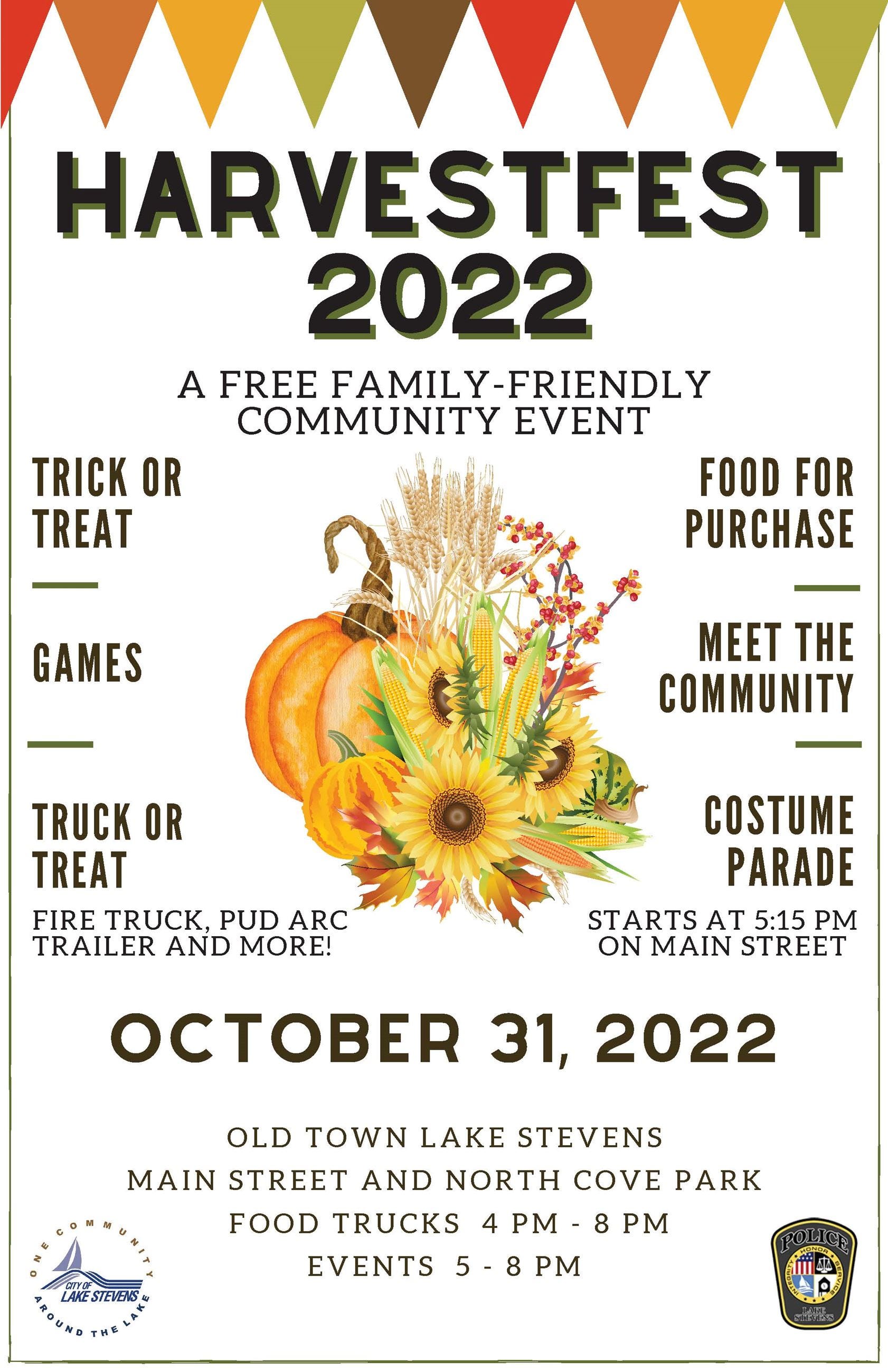 The City's annual HavestFest event is back at North Cove Park on Monday, October 31, 2022, from 4 - 8 pm. This is a free, family-friendly event.