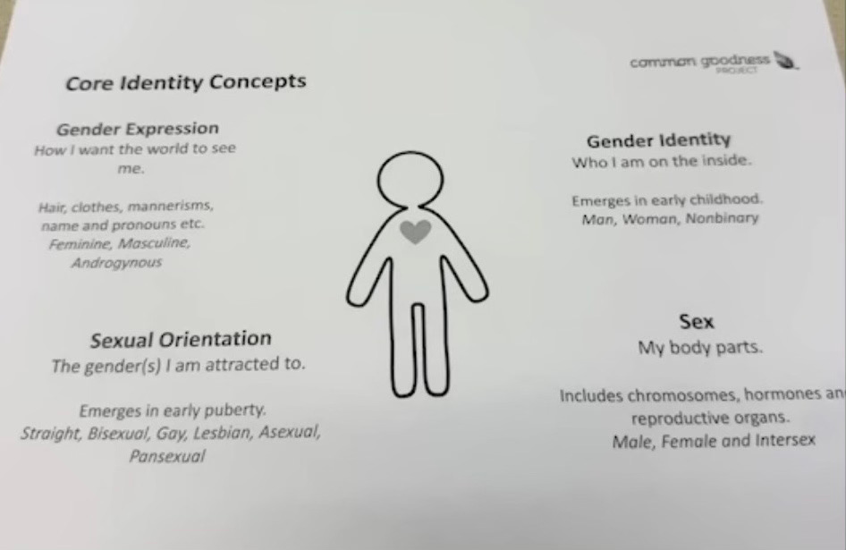 In response to the safety concerns, the school responded with gender theory handouts, including a sketch of a genderless stick figure surrounded by gender theory language.