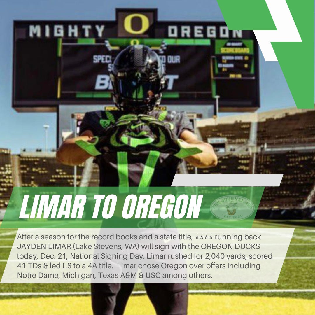 LAKE STEVENS — After a season for the record books and a state title, ⭐️⭐️⭐️⭐️ running back JAYDEN LIMAR (Lake Stevens, WA) signed with the OREGON DUCKS today, Dec. 21, National Signing Day.