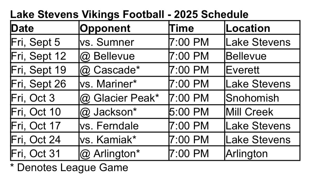 League play commences on September 19, with an away game against Cascade. The Vikings dominated Cascade in their 2024 meeting, securing a decisive 57-0 win at home, and will be looking to replicate that success on the road.