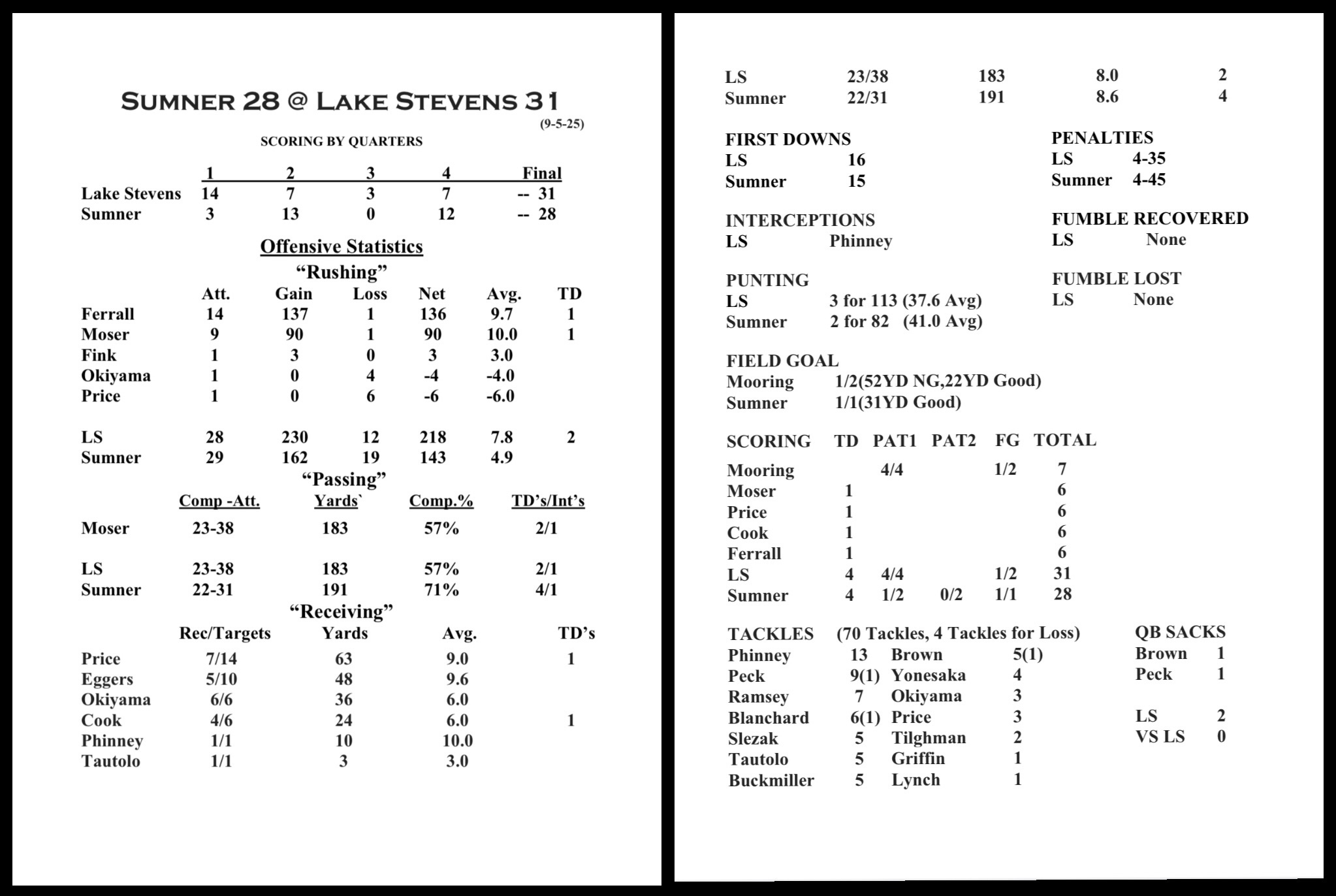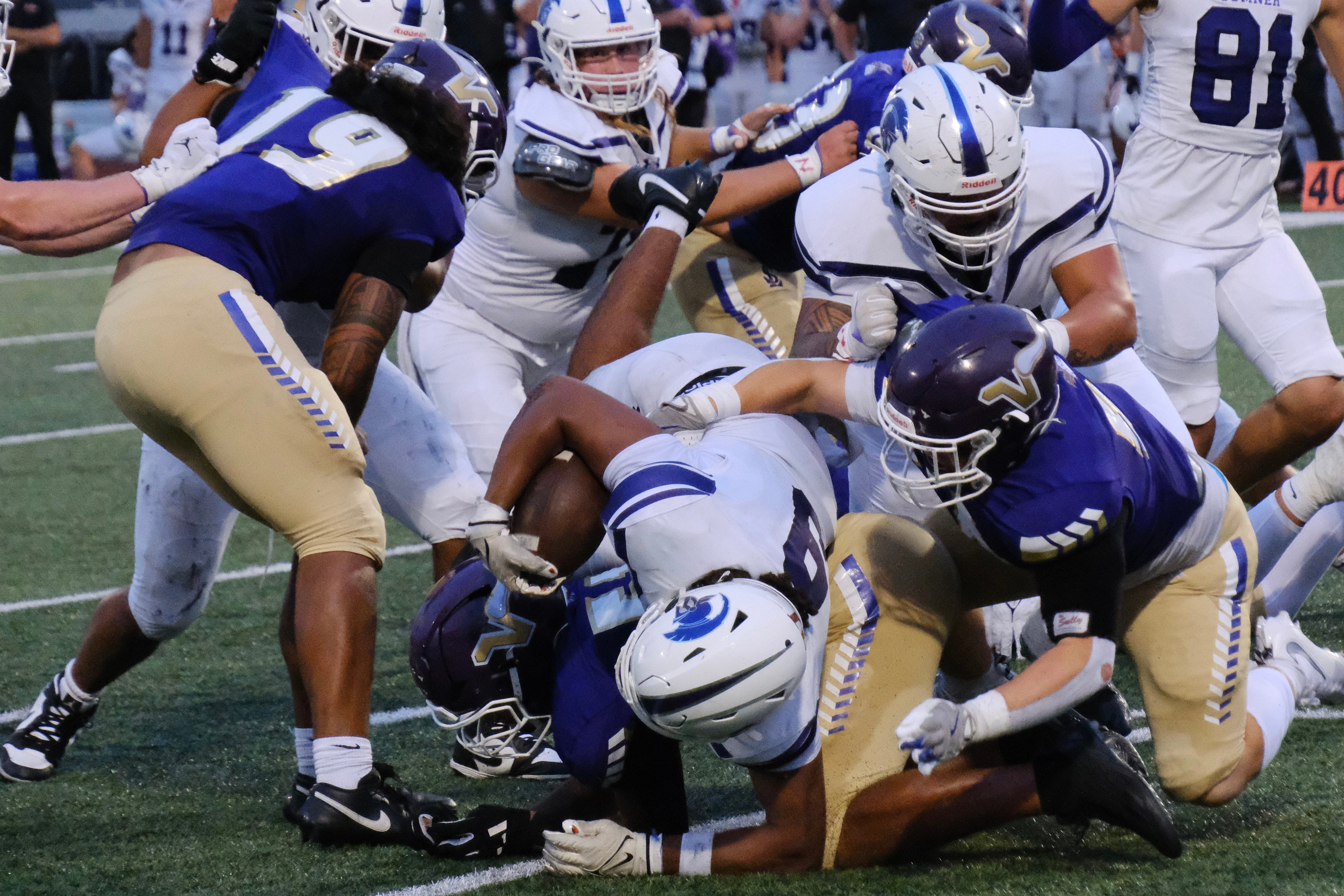 Safety DYLAN PHINNEY led the Viking D with 13 tackles and an interception. Fellow captain KAIDEN PECK added nine tackles and a sack in his return from injury. The Senior linebacker broke his leg a year ago at Sumner. Senior DL KEEGAN BROWN added a sack.