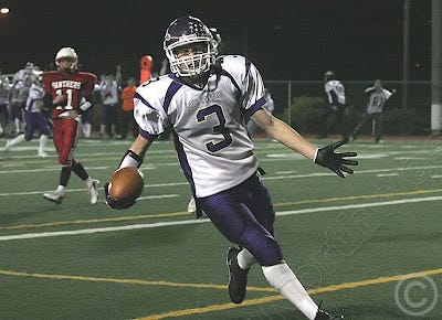WR Colton Tupen mugs for Rob after snaring a 31-yard TD pass with 44 seconds remaining at Snohomish, bringing the Vikings within an extra point of tying the Panthers. Tupen went off Friday, hauling in 10 passes for a record-tying 194 yards and two TD's. Rob Carlson/Sportsmedianorthwest
