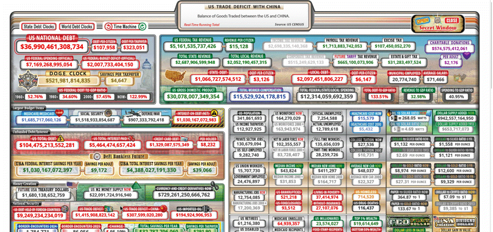 (Cut to a ticker tracking the real time increase in the National Debt.)