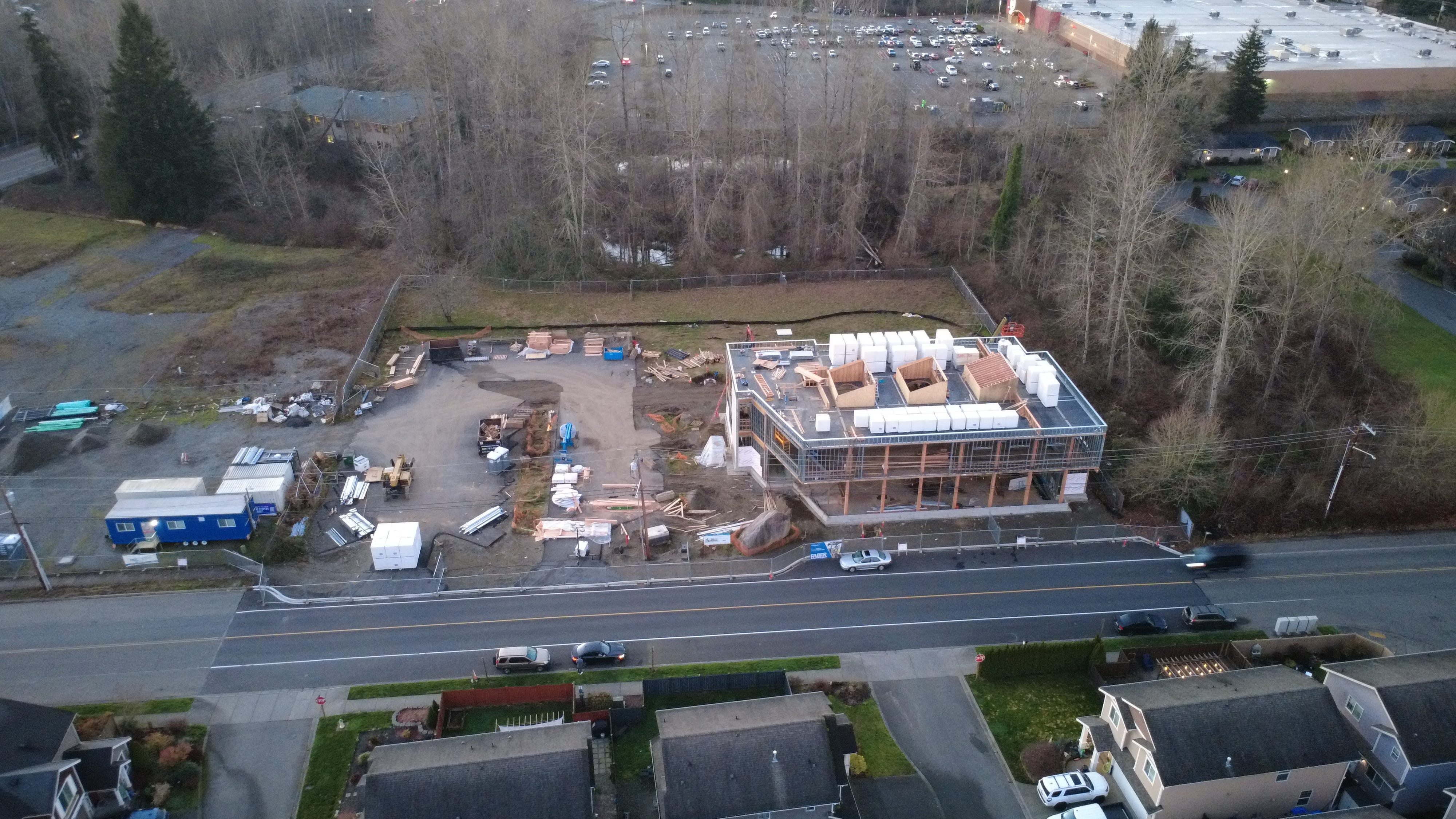 As of yesterday, January 19, 2026, construction has progressed significantly, with a free-standing two story structure now visible on the lot, after Sno-Isle installed cross-laminated timber walls in late November.