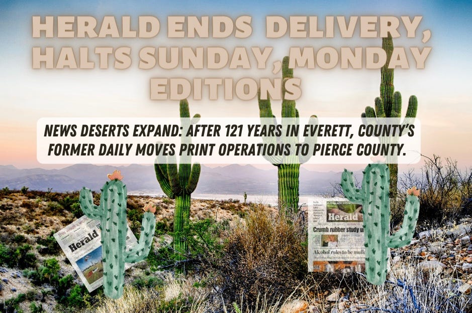 After 121 years in Everett, printing ops moved to Pierce County…employees notified of impending changes in all-staff email…route delivery to end Jan 2