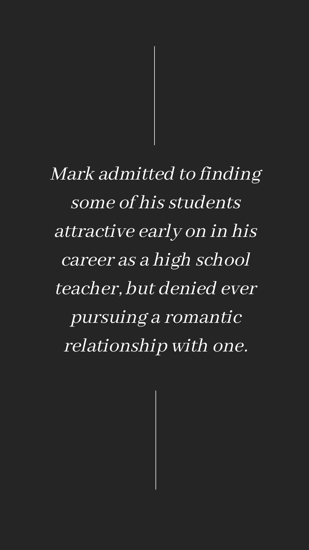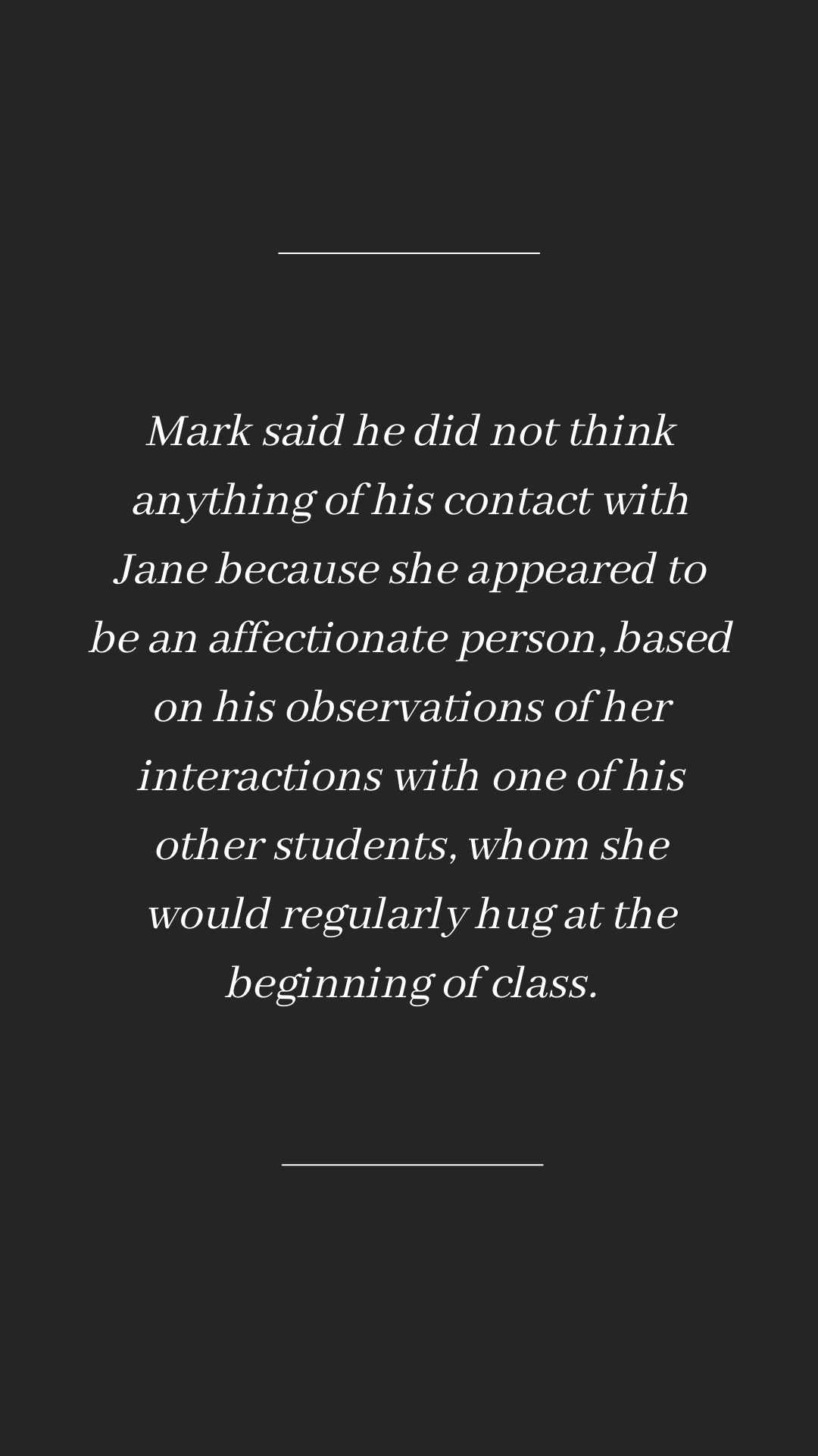 Mark started rubbing JANE ’s thigh about two weeks into the school year….He touched her thigh at least one time each class…JANE was wearing pants every time he rubbed her thigh, but several times she was wearing a pair of jeans that are ripped on the thigh. When she wore those jeans, Mark would touch her bare skin when he rubbed her thigh. When Mark touched JANE’s thigh, she would pull her leg away from him. Immediately before he touched her thigh, Mark would look around the classroom at the students doing their classwork. JANE believes he was checking to make sure he would not be seen touching JANE. JANE only told him not to touch her one time. When she did, Mark responded, “Why? I’m not doing anything wrong.” She said his response made her feel like she was crazy, so she did not want to keep repeating it.
