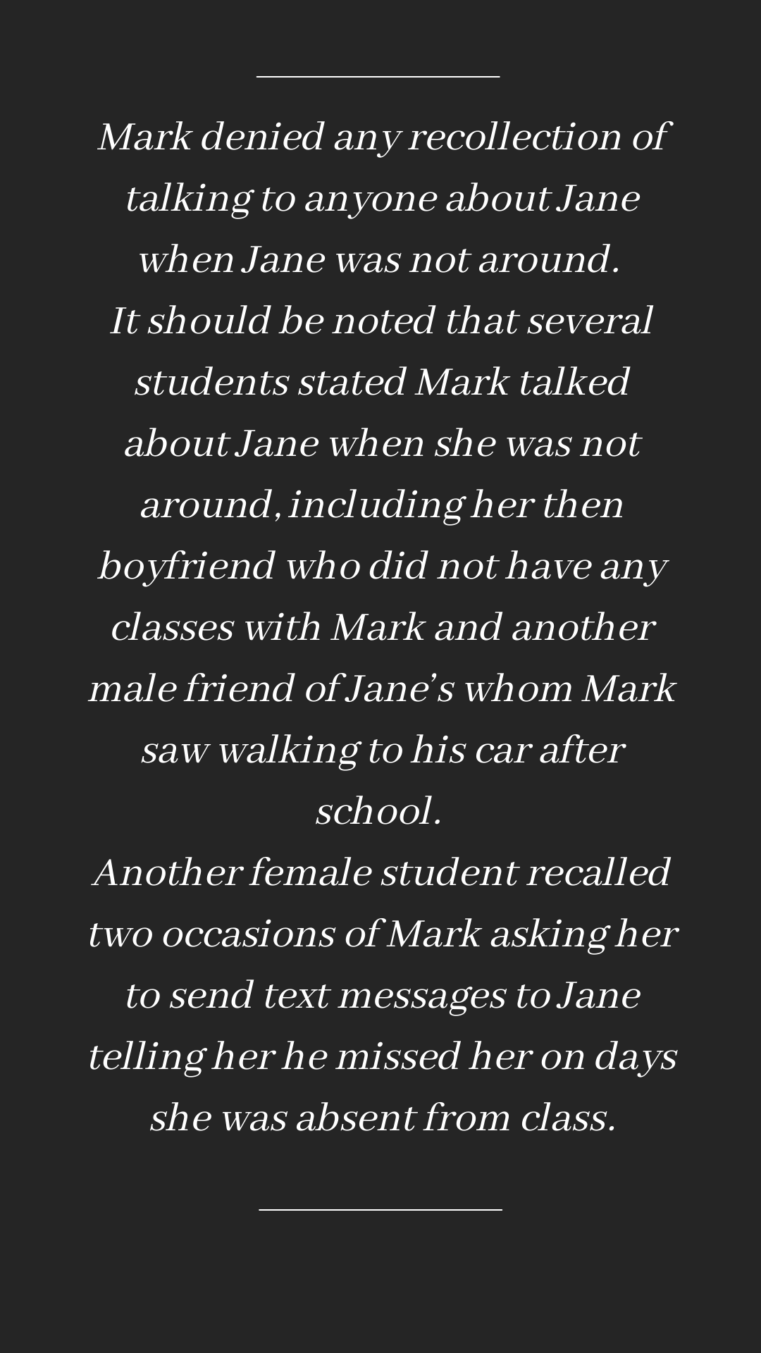 - Contacting other students to discuss Jane, including her boyfriends, with whom Hein discussed their dating relationship with Jane.