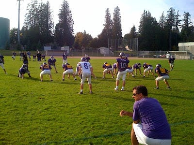 Coach Tom Tri looks on as the first team defense practices against the scout team. Notice RB/WR Tyler Reside wearing the #8 of Jackson's Riley Carr.